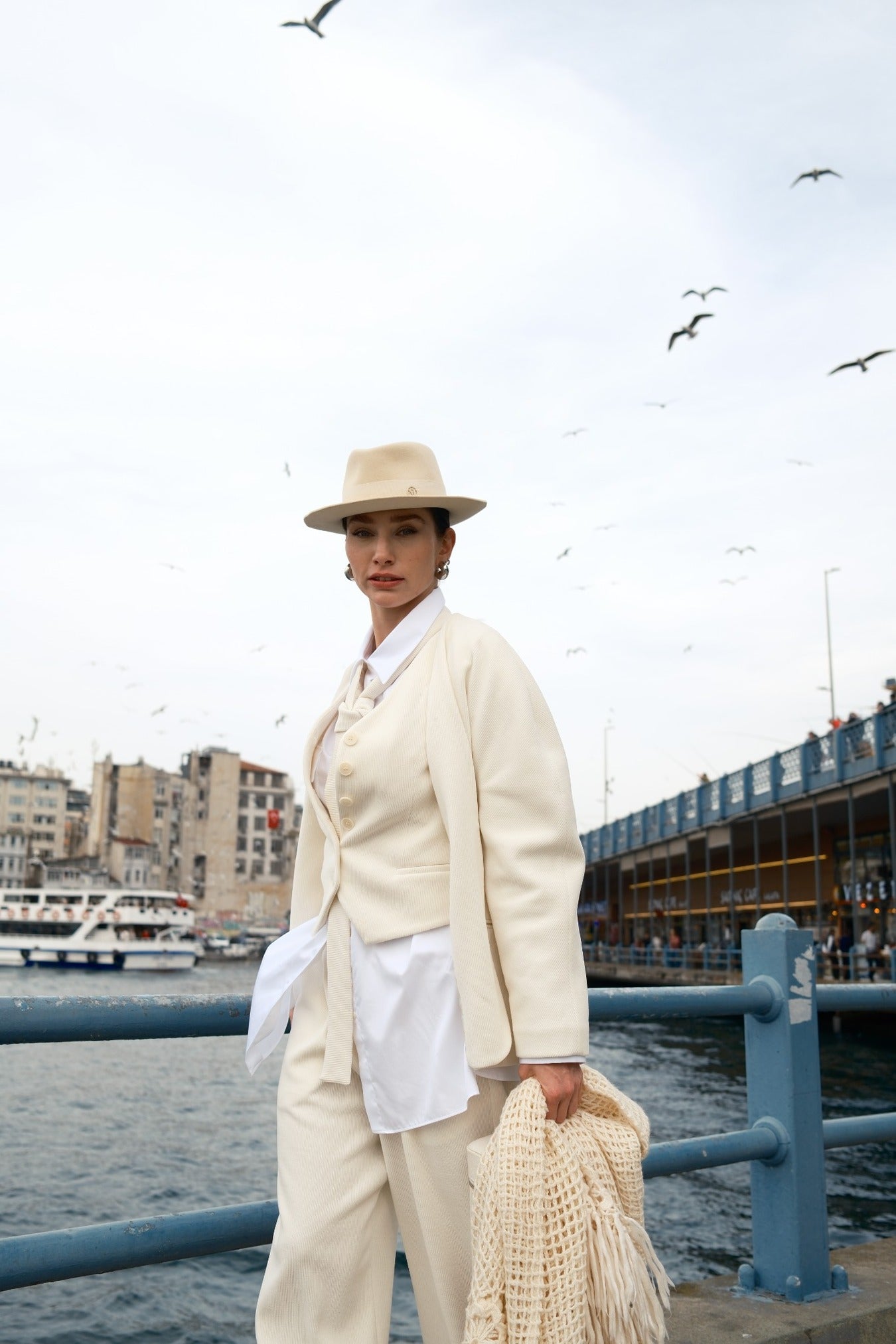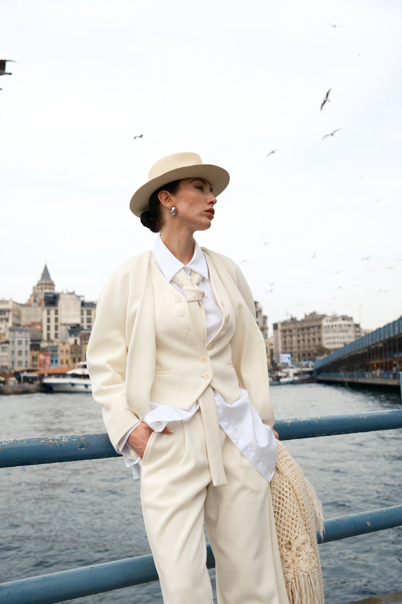 Modern zarafet ve maskülen çizgiyi bir araya getiren bu kadife yelek, heykelsi duruşu ve kusursuz formuyla dikkat çeker. Yumuşak dokulu krem tonu, yapısal omuz hattı ve temiz bitişleriyle güçlü, sade ve zamansız bir siluet sunar. Şehir şıklığından özel davetlere kadar birçok stile uyum sağlayan tasarım, minimal ama etkileyici bir ifade yaratır. Gardırobunuzda uzun yıllar değerini koruyacak sofistike bir parçadır.